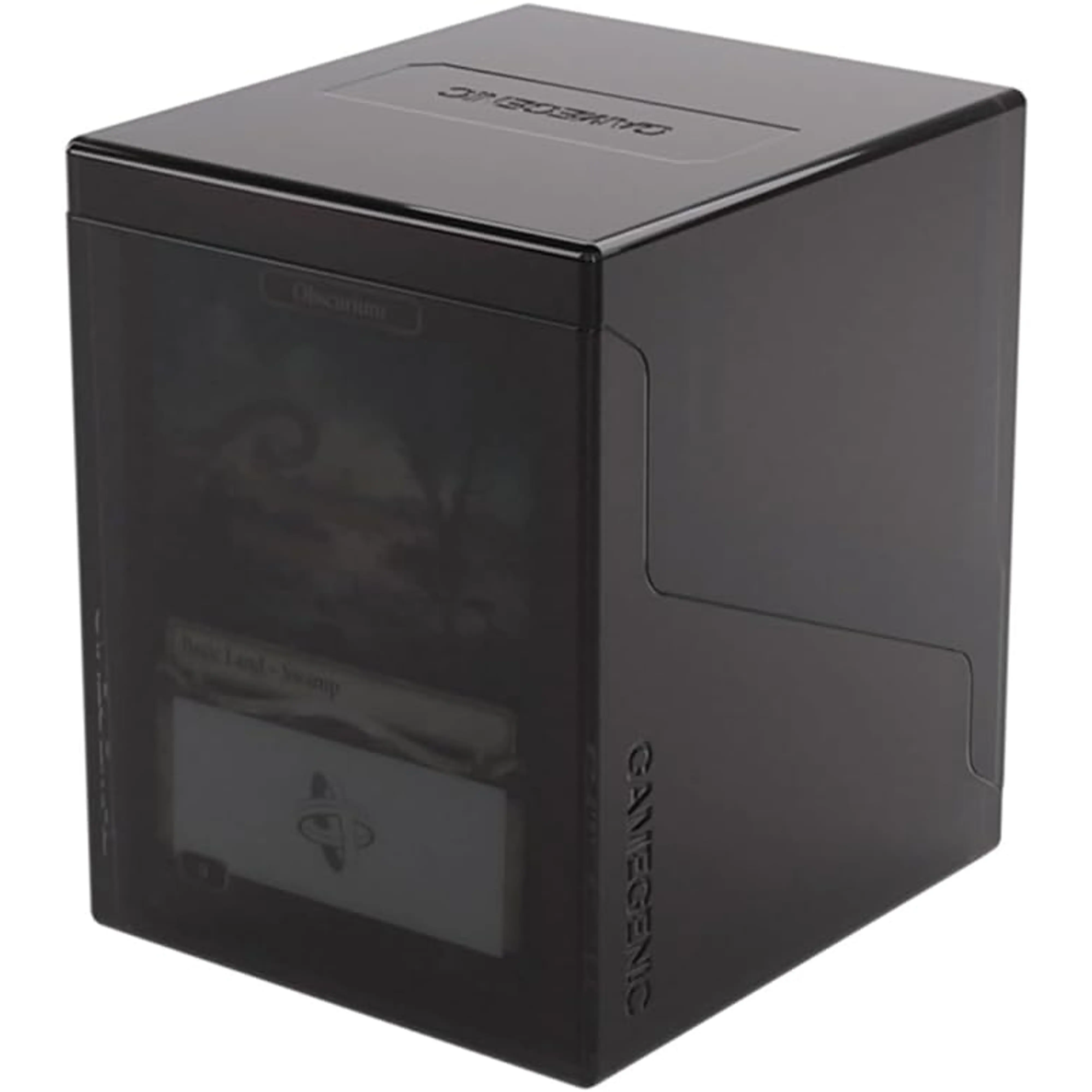 Bastion 100+ XL je izjemno kompaktna in trdna škatla za karte, zasnovana za varno shranjevanje več kot 100 dvojno ovitih kart v debelih notranjih ovitkih (Thick Inner Sleeves). Zaradi prosojnih materialov in pametne postavitve zapiralnih zavihkov je zgornja ali poveljniška karta (Commander) popolnoma vidna od zunaj, brez potrebe po odpiranju škatle.