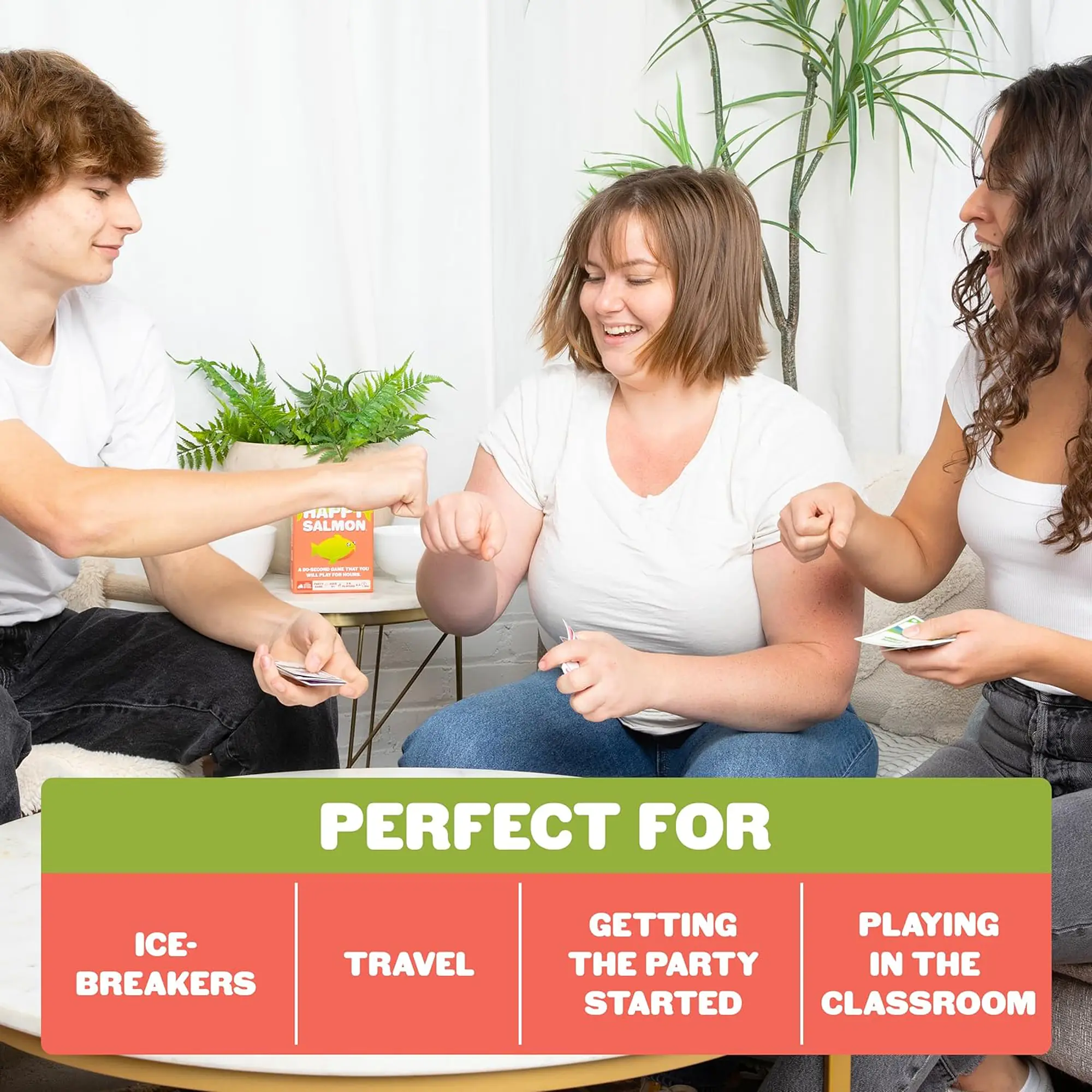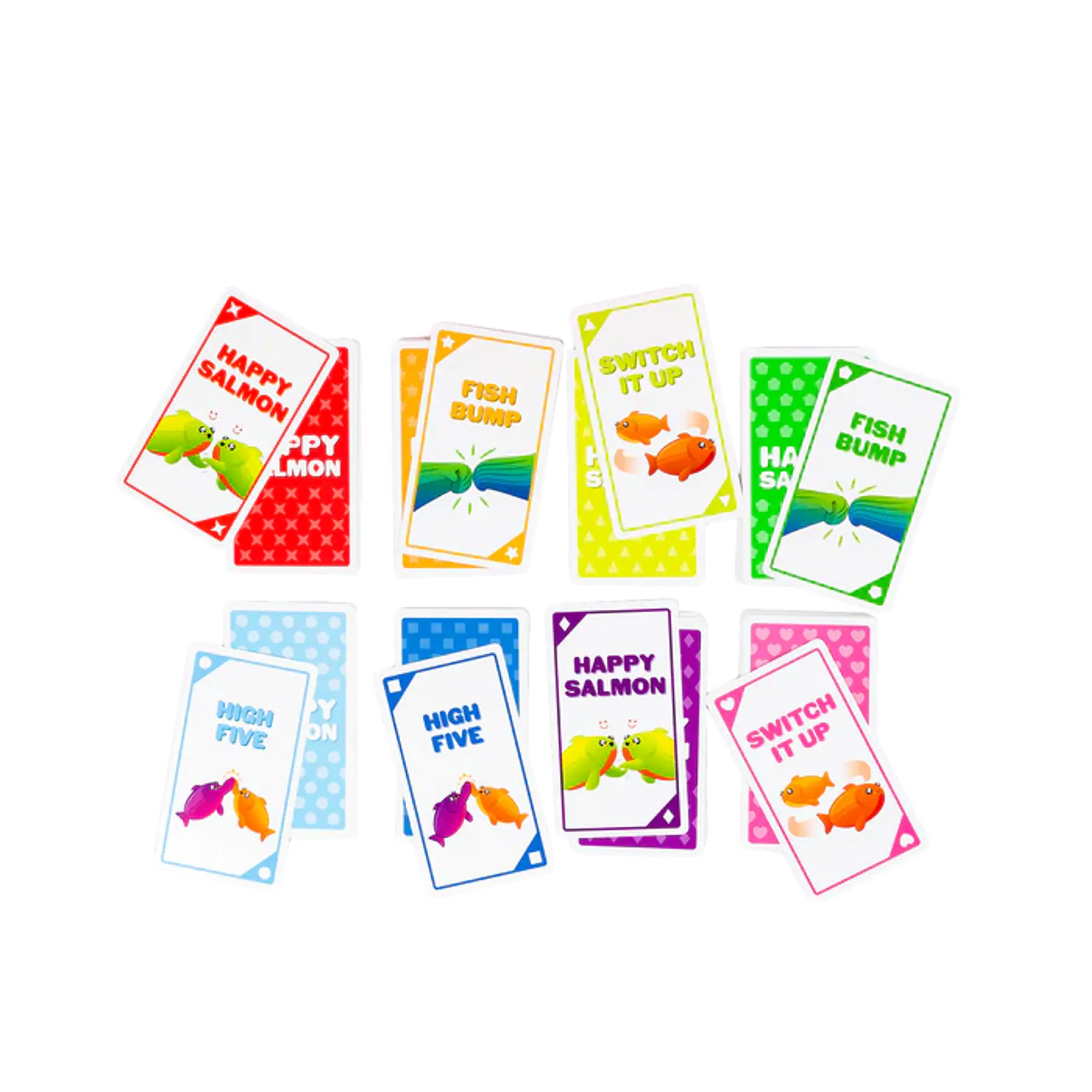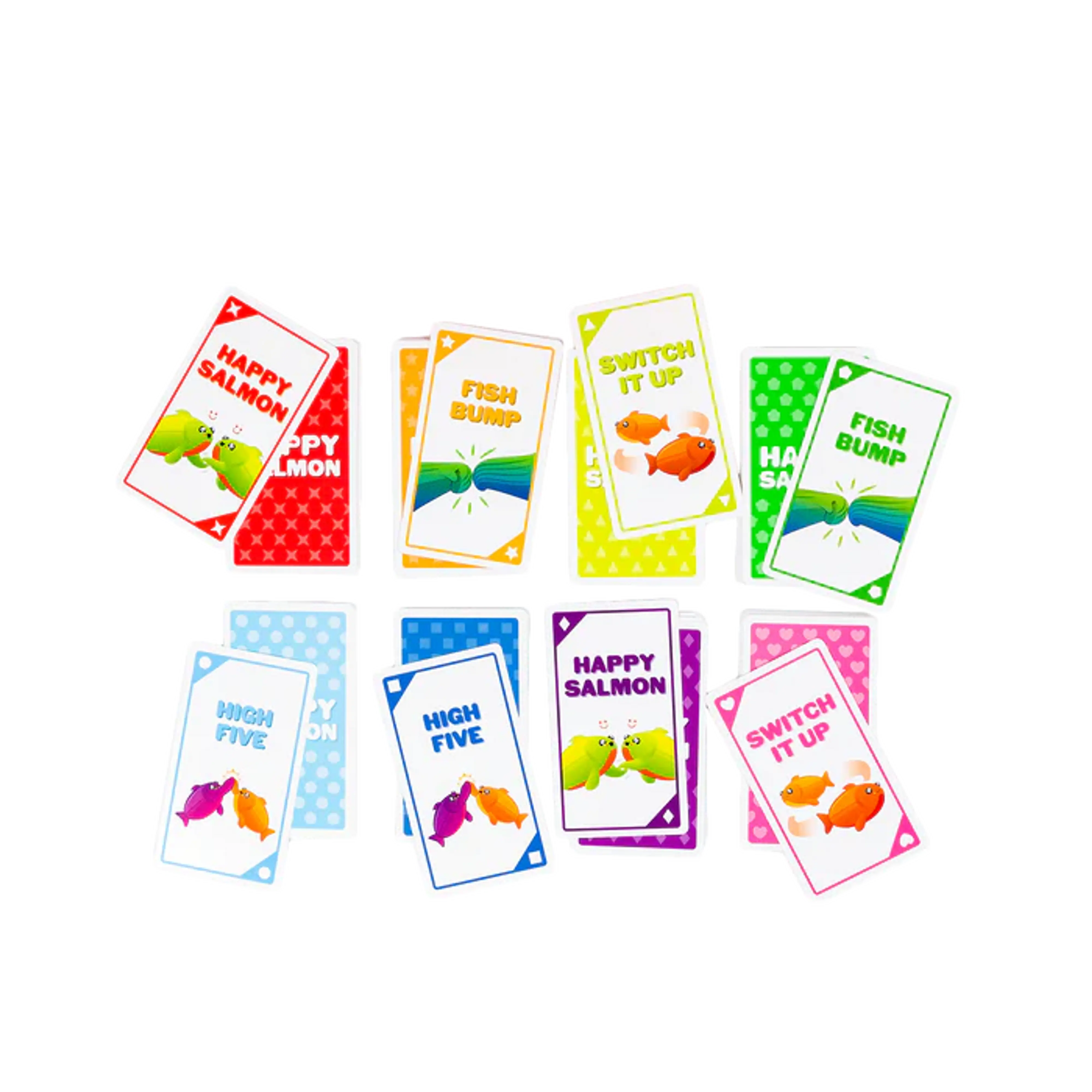 Vsak igralec ima svoj kupček 12 kart z akcijami (High Five, Fist Bump, Switcheroo, Happy Salmon). Vsi igralci hkrati iščejo druge, ki imajo enako akcijo, jo skupaj izvedejo in odvržejo karto. Cilj: Prvi igralec, ki se znebi vseh svojih kart, zmaga. Če ne najdeš para, karto prestaviš na dno kupčka in poskusiš z novo. Igra se lahko igra tudi brez besed – samo z gestami, kar doda še več smeha.