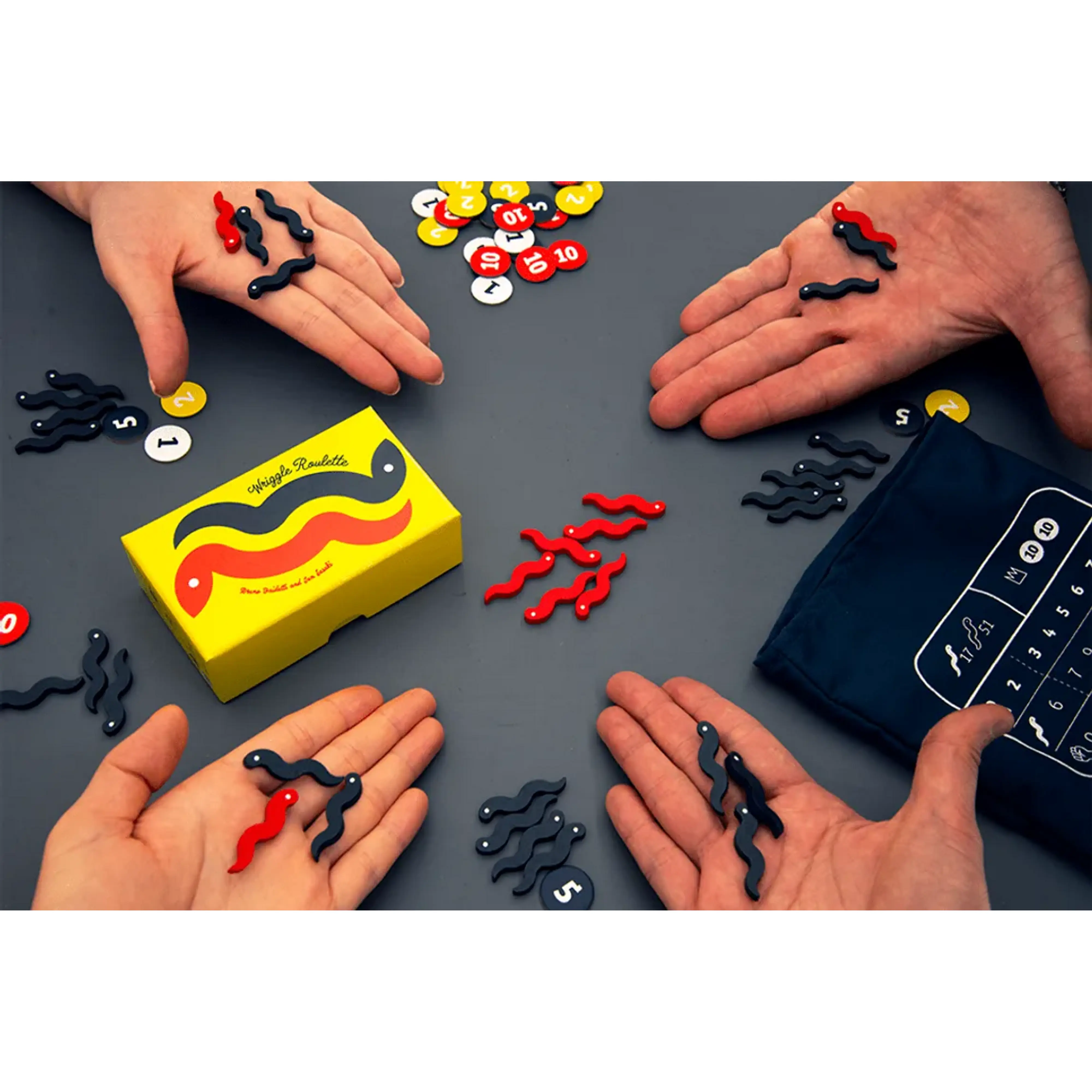 Wriggle Roulette je zabavna, napeta “push‑your‑luck” igra, v kateri igralci izmenično segajo v vrečko polno jegulj in kač. Igralci želijo nabrati čim več jegulj, vendar morajo paziti na kače, saj skupno število kač, ki jih ekipa izvleče, lahko sproži snake outbreak — izbruh kač, pri katerem igralec, ki je pobral največ kosov, izgubi vse svoje jegulje. Gre za preplet tveganja, blefa, opazovanja nasprotnikov in nadzora lastne pohlepnosti.
